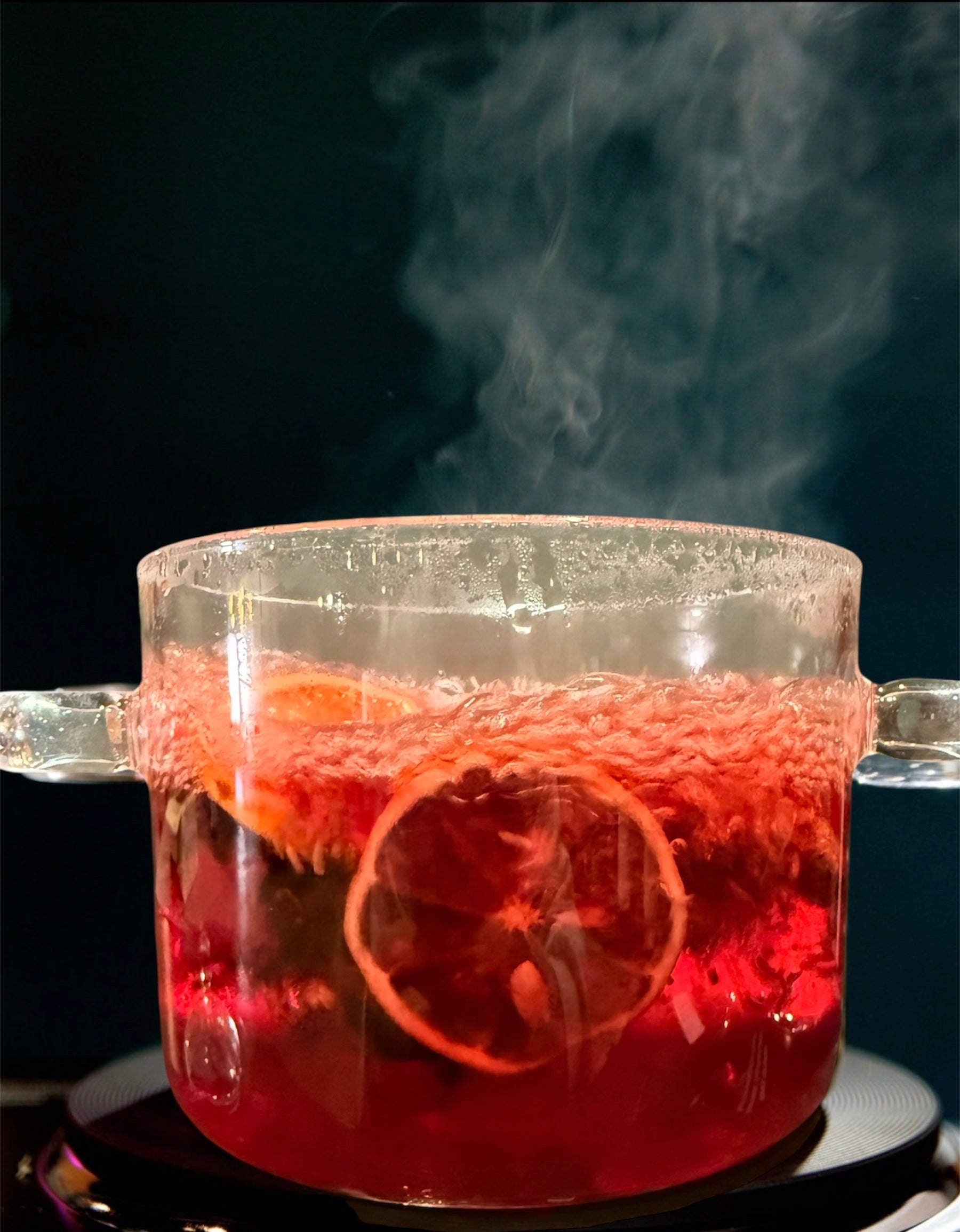 Rose petals, lavender, hibiscus, dehydrated orange, dehydrated lemon, clove, cinnamon stick
